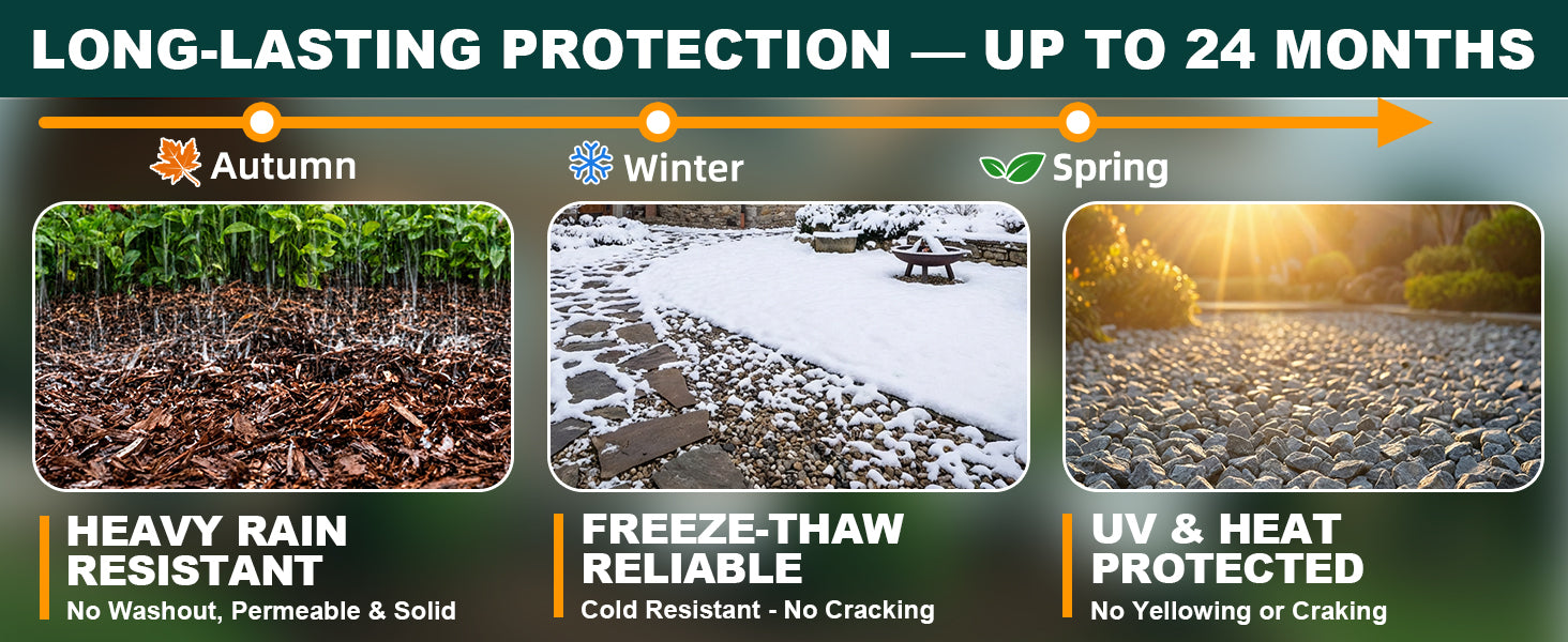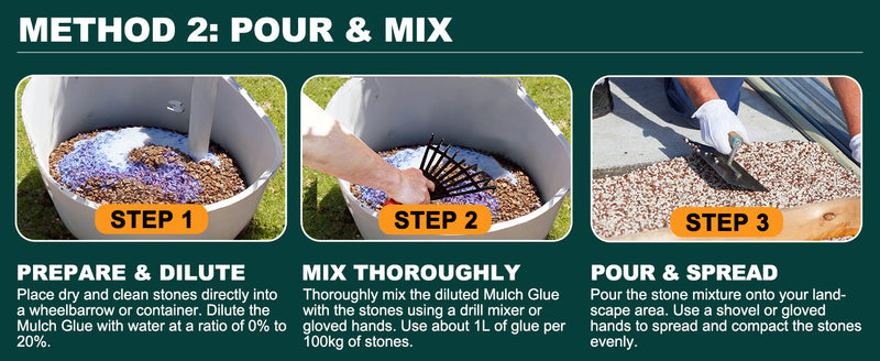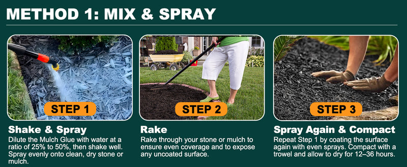 ✔ Apply glue evenly over the surface using a sprayer or watering can. ✔ Lightly rake or turn the gravel after the first coat. ✔ Apply 2–3 thin layers, let each coat dry fully. ✔ Glue dries clear within 12–24 hours, depending on weather. ✔ Treat mulch in layers no deeper than 1 inch to ensure even bonding. ✔ A light annual reapplication helps maintain performance in high-traffic areas.