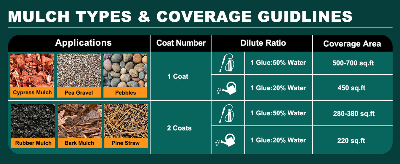 ✔ Best applied in warm, dry weather above 50°F / 10°C. ✔ Avoid applying Mulch Glue during rainy or high-humidity conditions, humidity is below 70% ✔ Make sure no rain is expected in the next 72 hours. ✔ In hot climates, glue dries faster—consider adding more water to avoid nozzle clogging.
