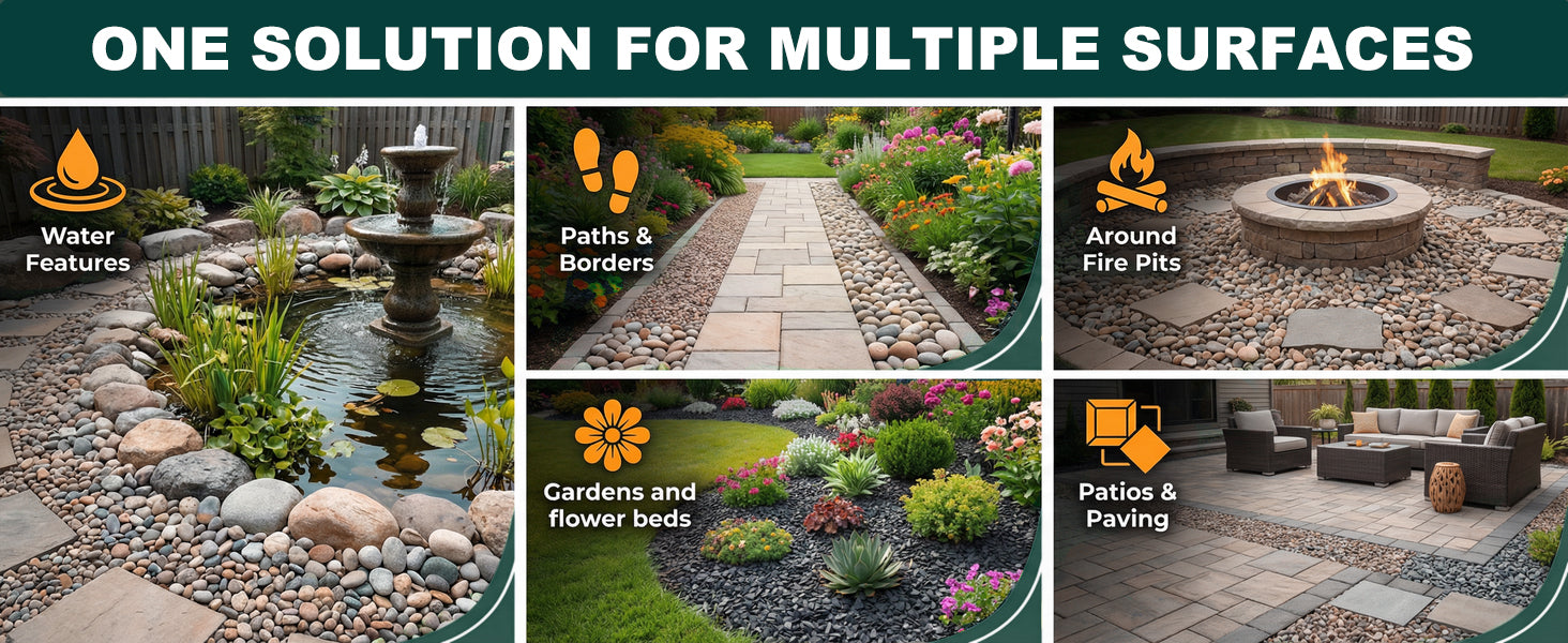 ✔ Always apply to a dry, clean, and stable base. ✔ Remove loose debris, dirt, oil, or old mulch before use. ✔ Use only on well-drained surfaces. Avoid muddy or water-logged areas. ✔ If working with older gravel or stones, rinse thoroughly and let dry. ✔ Use mulch that is less than 3 inches in size.